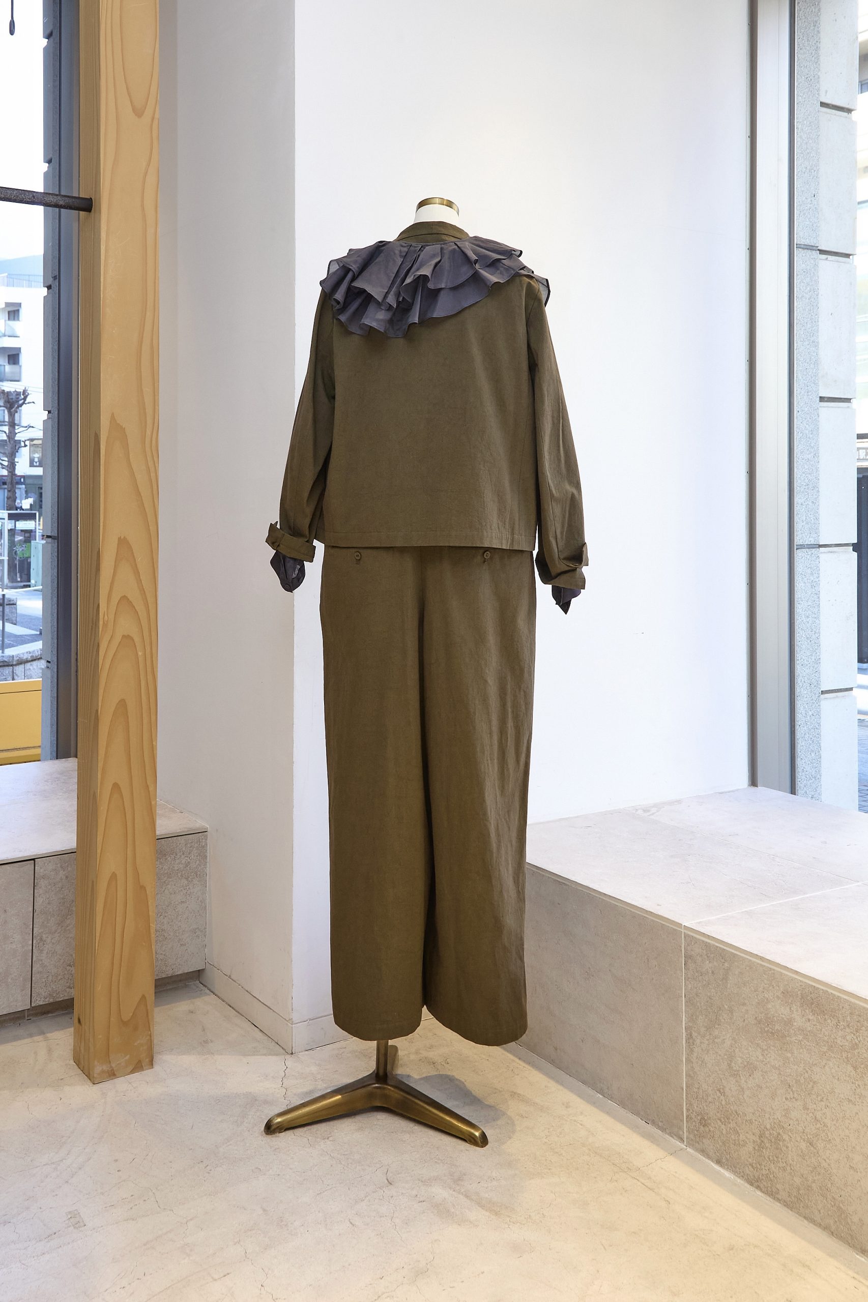 今シーズンのテーマ【CAT FLOW】からイメージした気まぐれで自由、それでいて優雅な“猫”を彷彿させるラフさが魅力のアイテムを提案。ジャケットは肩傾斜をなだらかにしつつ、立体的な襟周りなど、ゆるさと引き締めのバランスがとれた1枚。オールインワンはストンと着られ、ゆとりを楽しめるリラックス感が漂う仕立て。どちらもLOISIRの定番素材のひとつ、「グランジコットンポプリン」を使用。